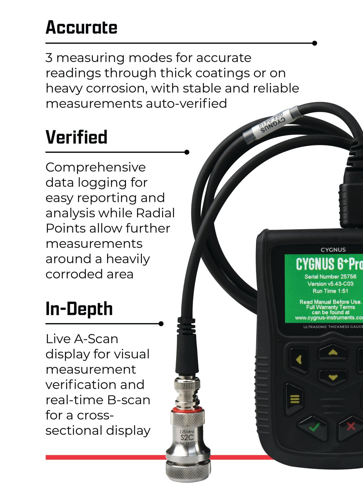 Cygnus 6+ PRO ultrasonic thickness gauge boasts a full range of useful features designed for the professional user.