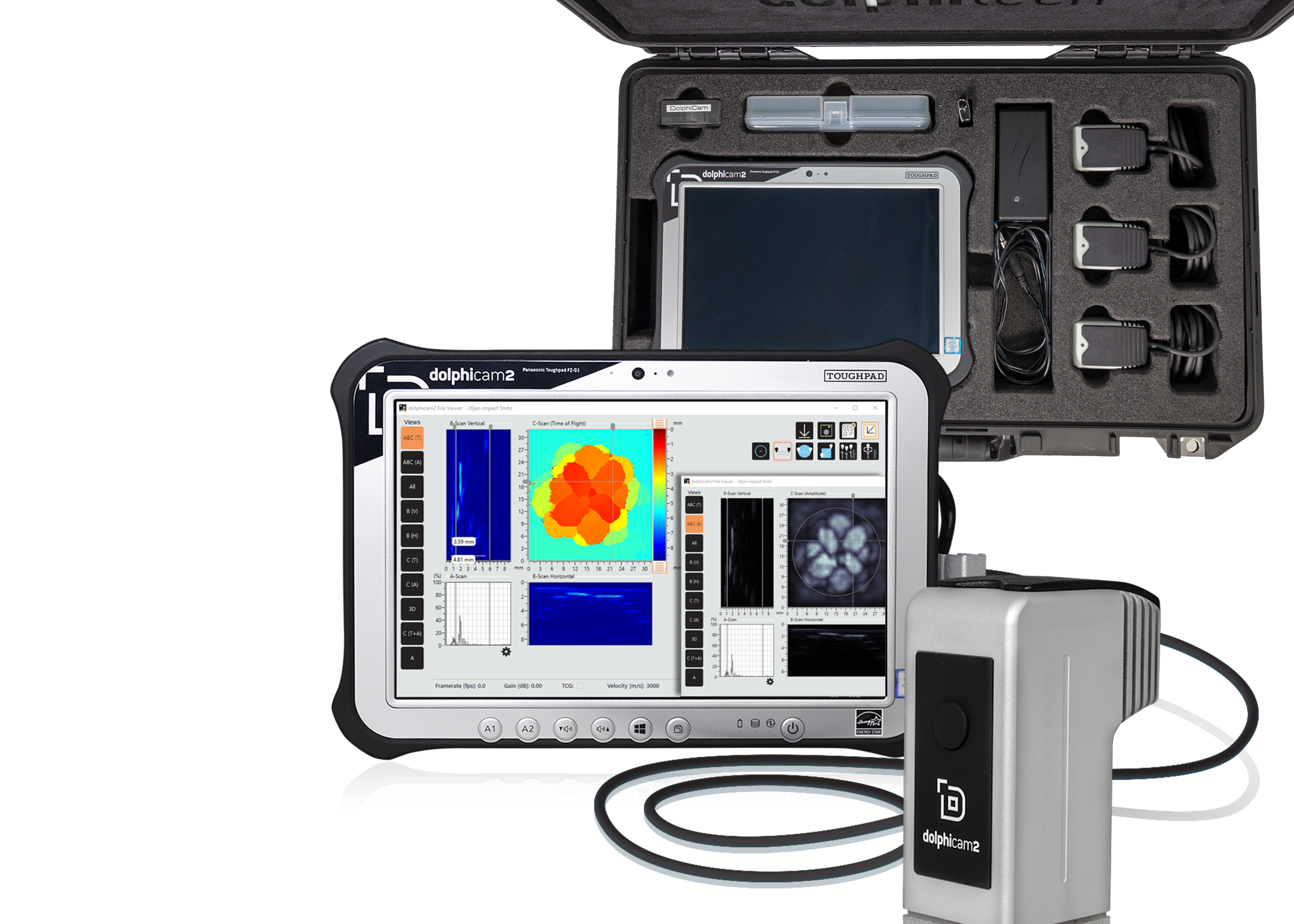 What’s on the screen? The dolphicam2 software is unique among NDT packages, designed from the ground up to complement the imaging capabilities of the platform. Ultrasonic images are shown not just using conventional signal amplitudes, but also as time of flight, opening up a world of instant, color-coded thickness mapping. This is helped further by the live 3D views, which instantly enhance visualization and can be readily interpreted by non-specialists. For maximum image quality we also provide Total Focusing Method (TFM) reconstructions, with TFM images accessible both during the acquisition itself, and on previously acquired Full Matrix Capture (FMC) data files.