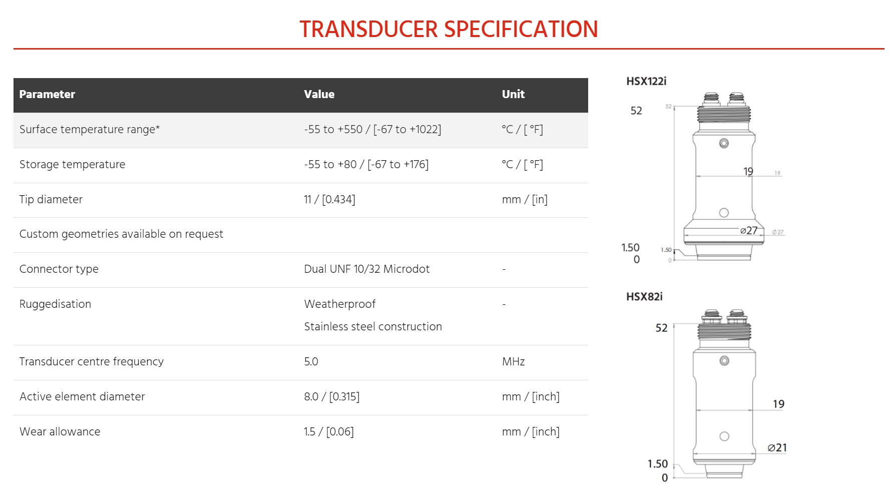 Harnessing the acclaimed HotSense™ ultrasonic platform, energized by the exclusive Ionix HPZ piezoceramic, our dual-element thickness gauging transducers offer unmatched versatility. Available in various frequencies and tip sizes, they excel in challenging environments. With a remarkable measurement temperature range of -55 to +550 °C [-67 to +1,022 °F], these transducers adapt seamlessly to all in-service assets. No additional cooling is required up to 350 °C / 662 °F, enhancing productivity between calibrations and minimizing duty cycling. Their stability ensures a dependable signal for optimal reliability and repeatability, while enhanced wear resistance equips them to thrive even in the harshest environments and applications.