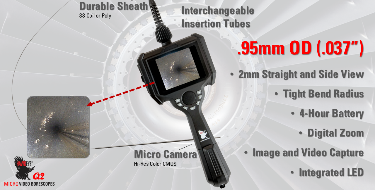 Gradient Lens Hawkeye® Q2 HD Video Borescope features diameters of 2.8, 3.9 and 6mm. The Q2 features new technology that will allow our customers to change insertion tubes, and offer a dual 0 and 90 camera view. The Q2 Video Borescopes offer 4-way joystick articulation, image and video capture, and 4 hour battery life combined with a compact, portable and durable design. Expanding on the popular Hawkeye V2 and V3, which were launched in 2012, the new Q2 incorporates technological advancements that expand the offering of video borescopes offered by Gradient Lens Corporation. The Q2 easily displays and captures crystal clear video and still images, and does so using a lightweight, and user-friendly compact design. The Q2 is a valuable tool for our customers who have a variety of length and diameters needs but don’t have the budget to purchase multiple systems.
